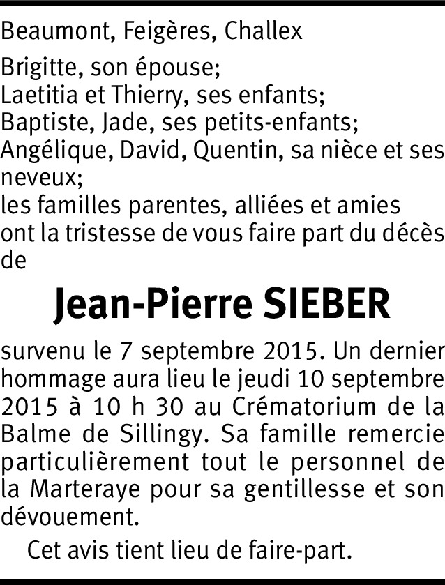 Il y a plus de 4 ans Signaler C'est avec tristesse que nous apprenons le décès de Jean-Pierre. Nous adressons à toute sa famille nos sincères condoléances. Courage, amitié. Henri et Brigitte Monney De la part de Brigitte et henri Monney