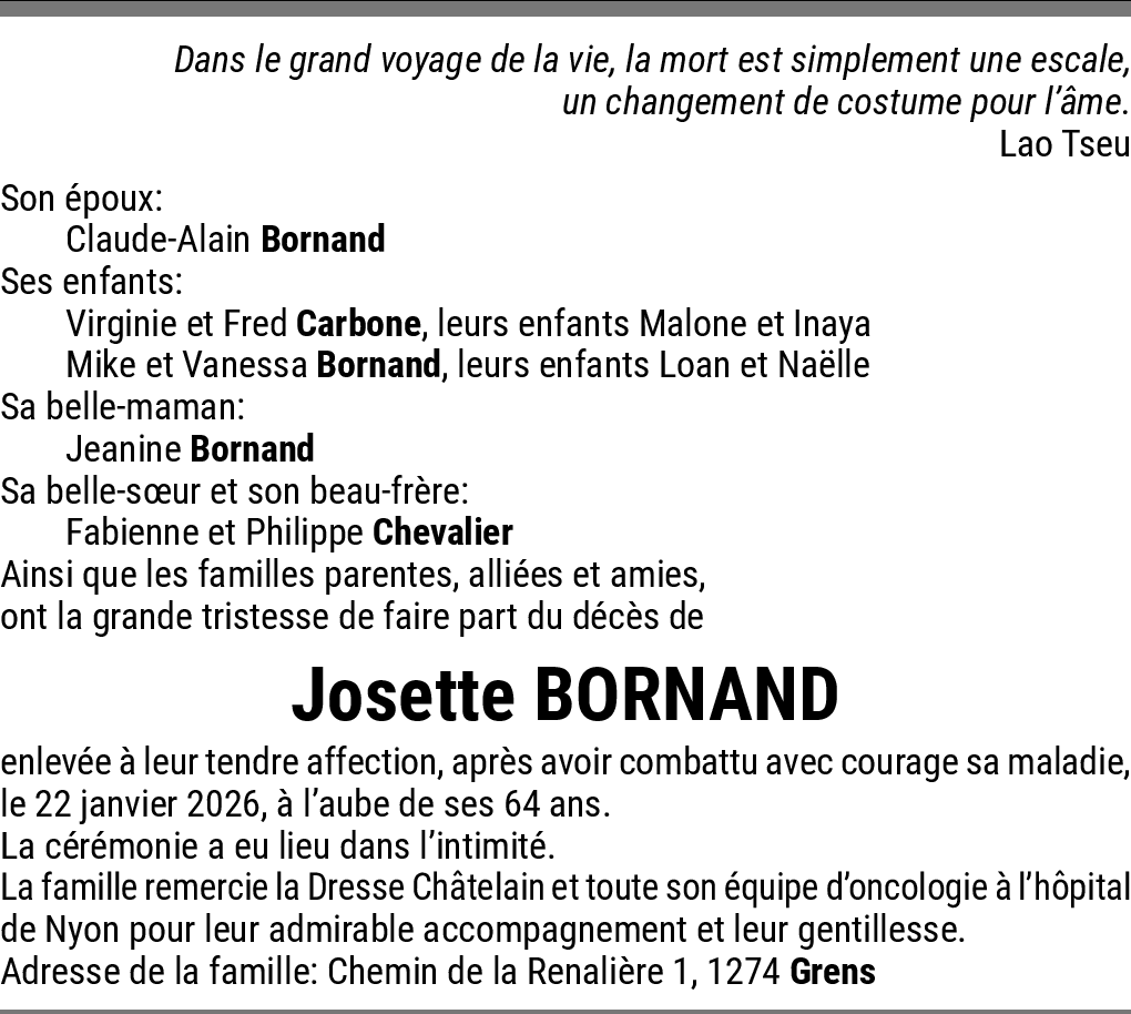 Partie bien trop vite 27.01.2026 Signaler La vie est injuste nous nous sommes SMS pour la nouvelle année. Je n’en reviens pas. À ton mari à ta famille vont toutes nos condoléances. De la part de Vullioud Roger et Lucie