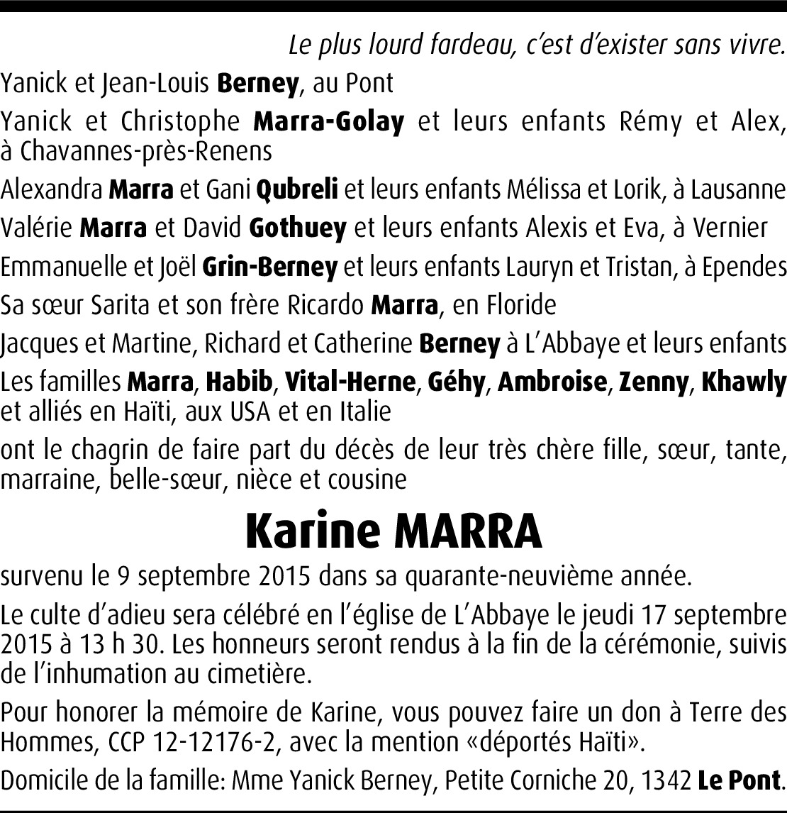 Il y a plus de 4 ans Signaler Chère famille, Le malheur qui vient de bouleverser votre famille nous a profondément touché. Sachez que nous sommes de tout cœur avec vous. Soyez assurés de notre chaleureuse sympathie. Fabrice, Najat et Naël Cuanillon De la part de Fabrice Cuanillon