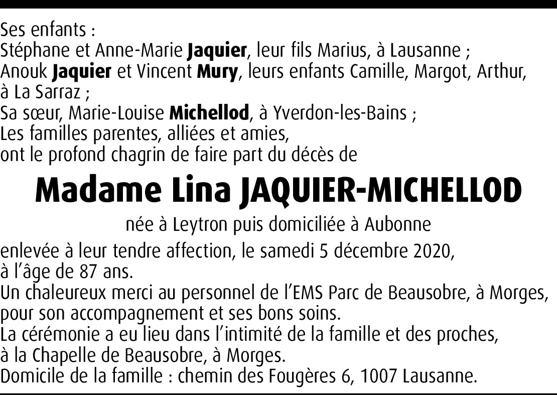 c'est avec beaucoup de peine que nous avons appris la triste nouvelle de la disparition de Lina, la dernière fois que nous l'avons vue, c'était à Beausobre avant le confinement et nous l'avons beaucoup côtoyée à Aubonne, quand elle faisait partie du choeur mixte, etc. Nous en gardons un très bon souvenir et sommes en pensées avec vous tous.