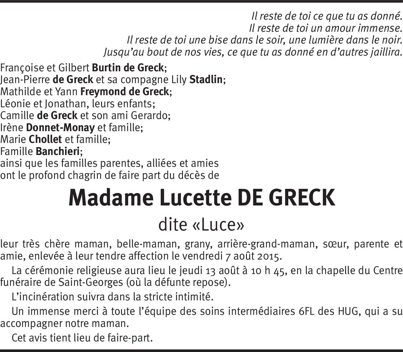 Nous ne pourrons pas vous entourer jeudi lors de la cérémonie religieuse à St-Georges car nous sommes en vacances dans le sud de la France mais nous serons en pensée avec toi et ta famille.