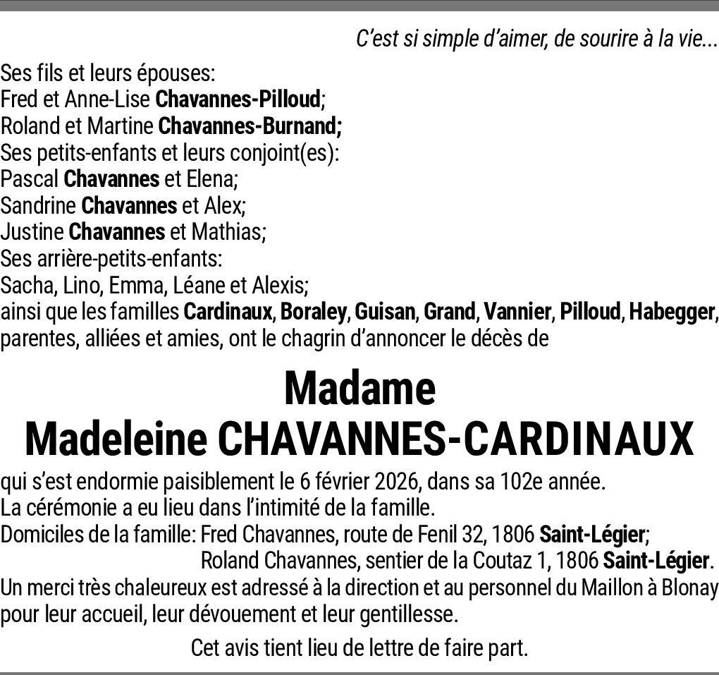 Le coeur d une maman est un bien précieux 13.02.2026 Signaler Je vous présente toute ma sympathie Elle ira rejoindre ma maman et partager les souvenirs de leurs amitiés consolidées parmi nous. Avec mes pensées attristées. Marlène Borloz, Fenil sur Corsier De la part de Marlène Borloz