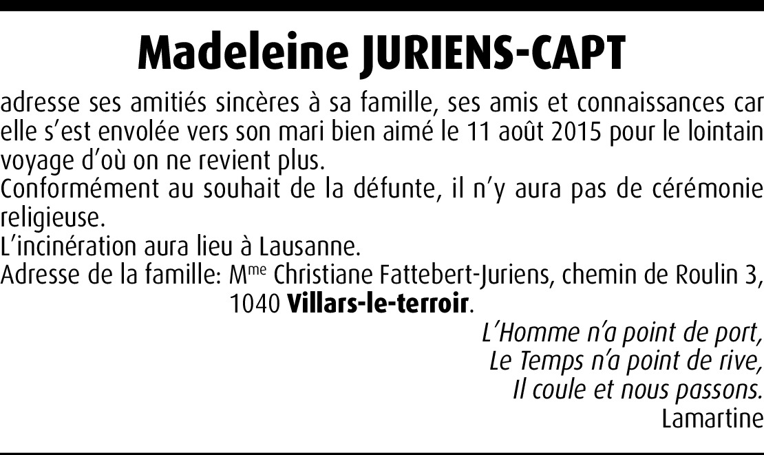 Mais... le bonheur et sa joie de retrouver son défunt époux qu'elle aimait d'un amour éternel... que dès qu'elle en parlait, c'était toute une poésie... ben la voilà à ses côtés... "Bel envol Madame Juriens... et bon repos auprès de votre bien aimé".