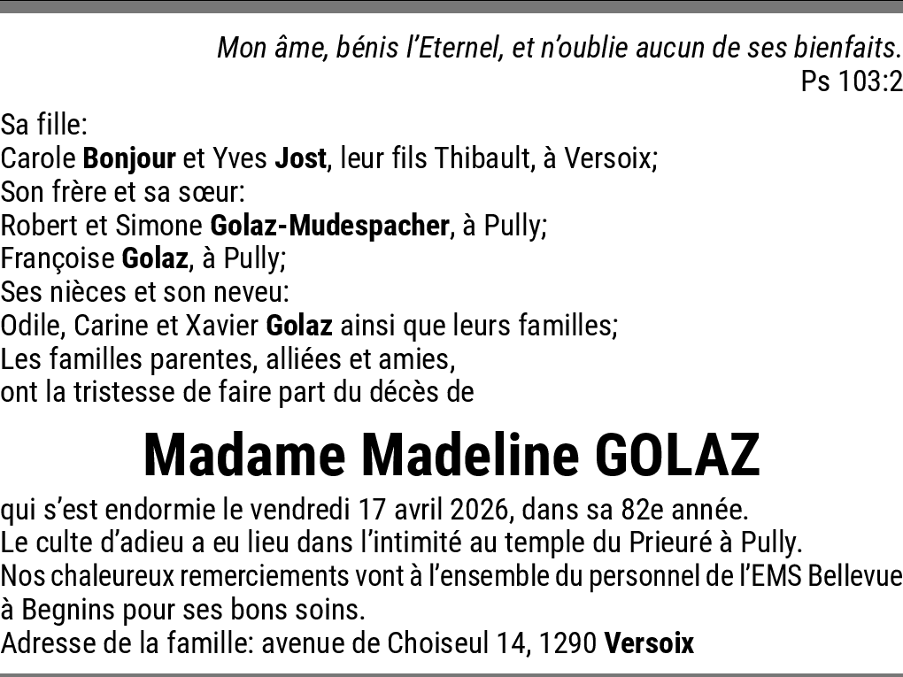 Madeline GOLAZ 23.04.2026 Signaler Chère Carole Je suis triste d’apprendre le décès de votre maman. J’ai beaucoup travaillé avec Madeline avec qui je m’entendais bien. Une personne si généreuse et dévouée aux autres. Avec mes sincères condoléances Antoinette De la part de Antoinette ENGEL