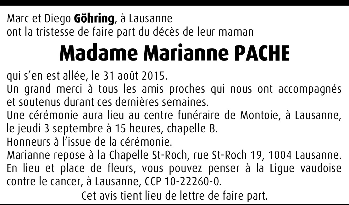 Il y a plus de 4 ans Signaler Sincères condoléances pour votre chère maman... Sa bonne humeur, son dynamisme vont beacoup nous manquer... Une relation du golf de Lavaux. De la part de Marine Chaillet