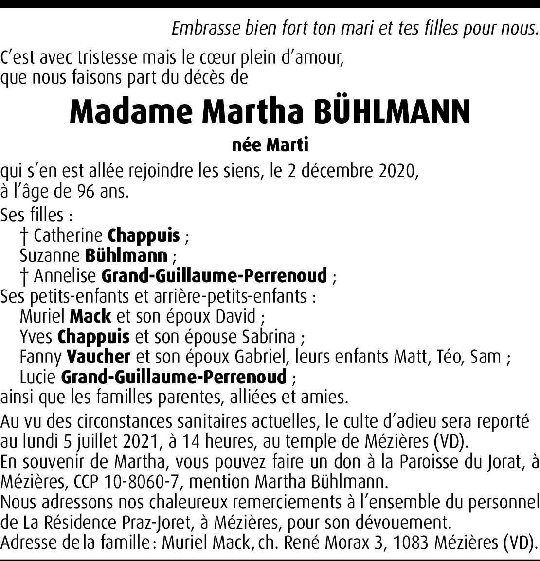 Il y a plus de 4 ans Report Chère Famille, nous sommes en pensées avec vous et nous vous présentons nos sincères condoléances. De la part de Jean-François Chappuis