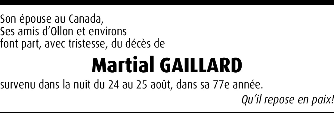 Cher Martial, que j'avais surnome ici au Canada Papy, c'est avec une grande tristesse que j'ai appris ton départ vers d'autres cieux, mais cette fois sans voiture, de très bons souvenirs resteront à jamais dans ma mémoire. J'espère que ce voyage, que tu viens d'entamer, t'apportera la paix d'esprit. Victor aussi t'envoie toutes ses salutations et lui aussi bien peiné de ce départ précipité. Nous penserons bien à toi durant nos prochains barbecues et apéros; ne soit pas inquiet et si jamais tu reçois ce message, on ne sait jamais, fais-nous un signe; pas besoin d'écrire, tu n'aimes pas ça, juste un signe et sois sage en haut... lol ok. Bon voyage Papy lol.
