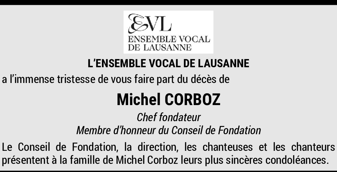 Michel Rossier, mon père, a croisé le chemin de Michel Corboz, le vôtre, au début de 1960 au Valentin grâce à Dante Granato et a eu la chance de chanter à l’Ensemble vocal durant vingt ans. Michel Corboz a donc changé sa vie et la mienne.
