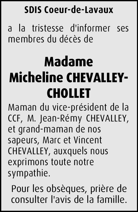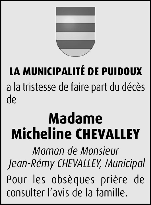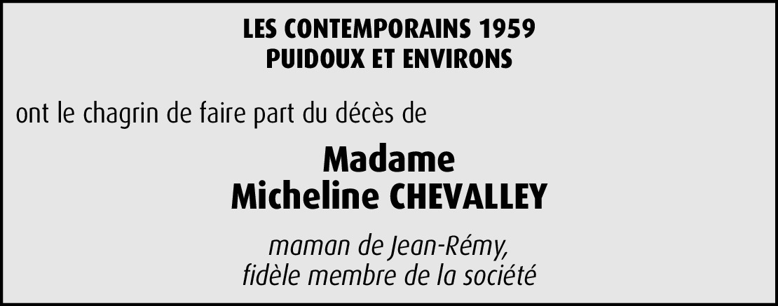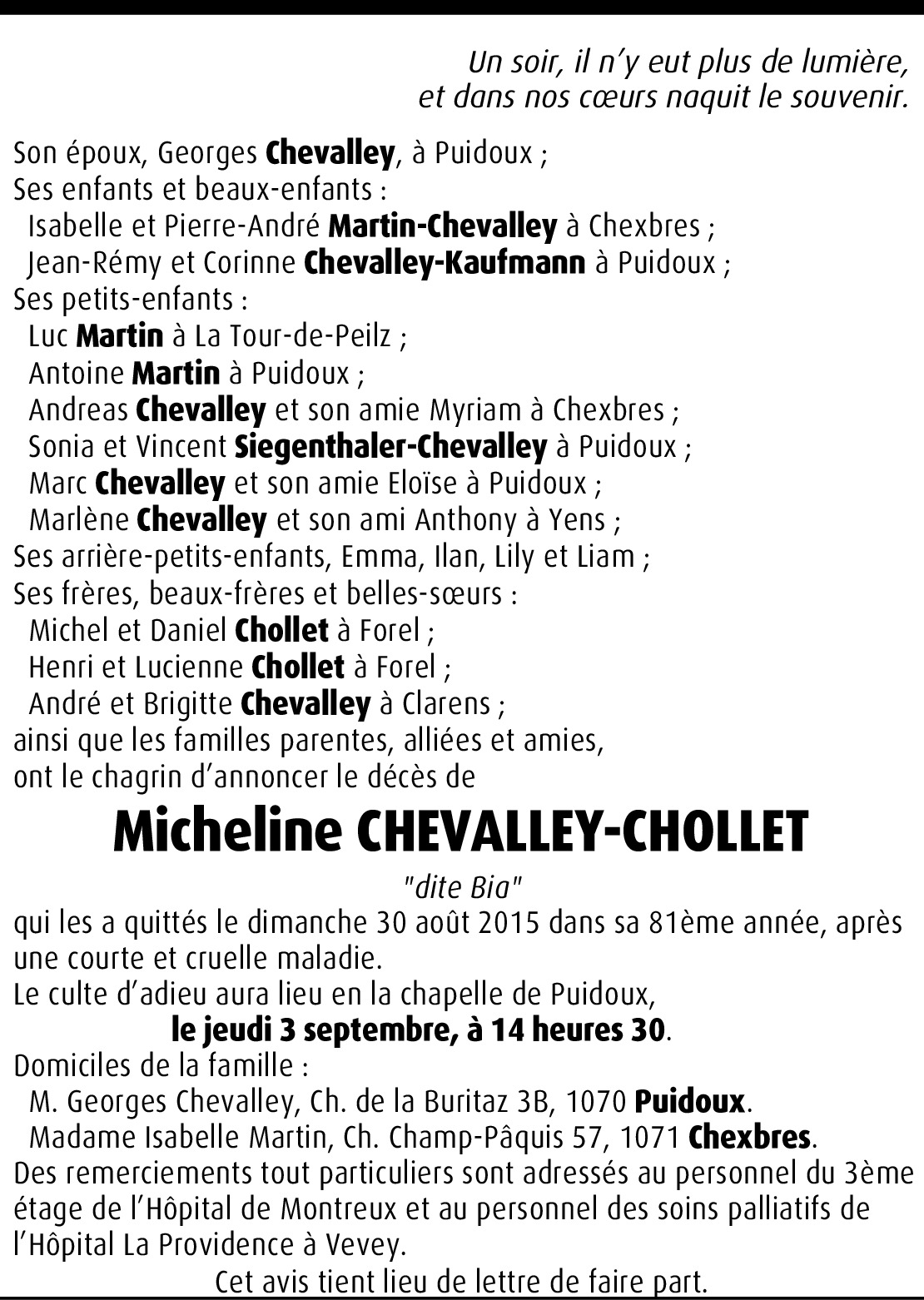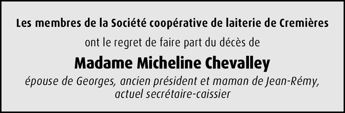 Chère famille Chevalley, je cherche aujourd'hui seulement et je trouve la réponse sur internet... Micheline est donc partie! Oui je garderai d'elle le souvenir d'une femme formidable, rien que la revoir ce printemps et lui annoncer mon mariage futur ma réchauffer le coeur! J'ai vendu quelques carottes à mes 12 ans avec elle sur le marché à ses débuts, le petit marché de Primapraz n'existait pas encore... une grande dame! Beaucoup appréciée, de tout cœur avec votre temps de deuil. Vivement nos retrouvailles à tous dans un meilleur ciel! Affectueusement Christelle