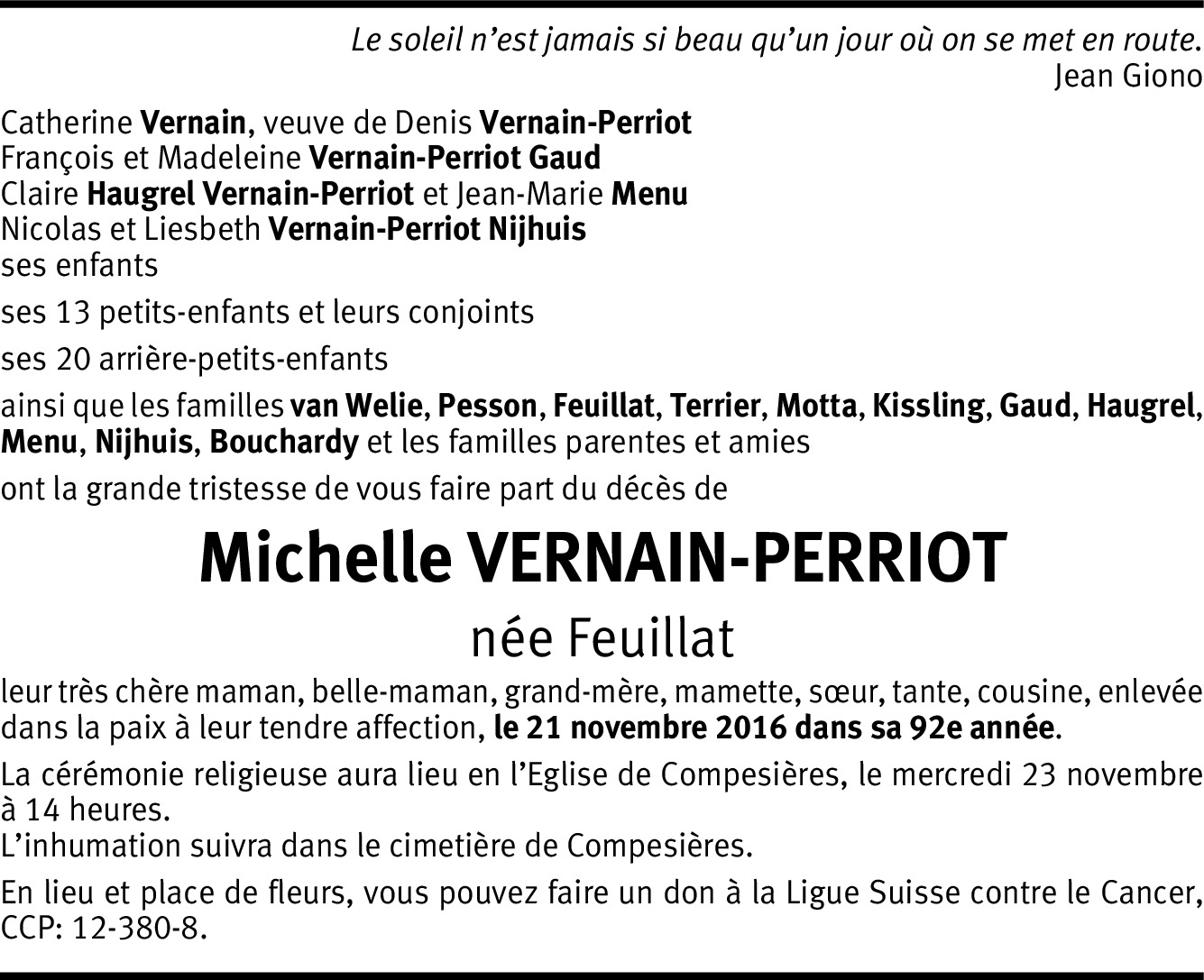 J'apprends avec tristesse, à l'étranger, le décès de Michelle.