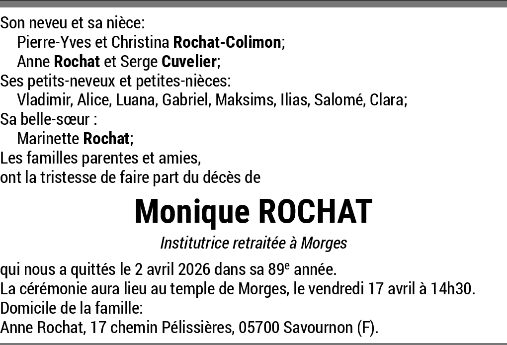 Je me souviens bien de Mme Rochat. Elle était mon institutrice de 1re et 2e année (avant Harmos). Je devais avoir 7 ou 8 ans. Elle était vraiment très gentille avec ses élèves. De très bon souvenirs.