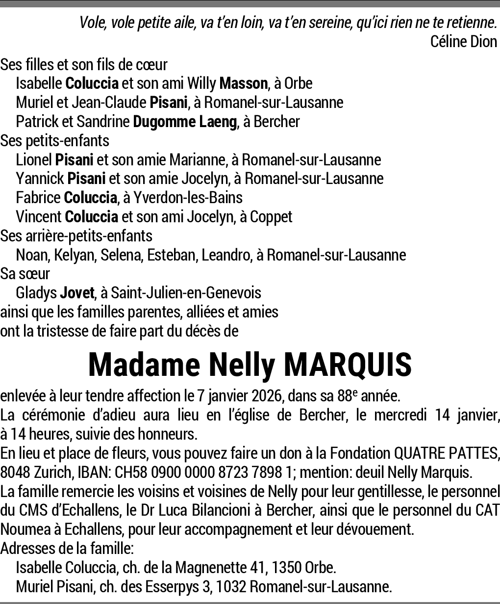 Touteslmes condoleances ala fafamille de madame nelly marquis que jai connu au cat noumea une tres gentille dame parti rejoindre les etoiles camevfais mal au coeur
