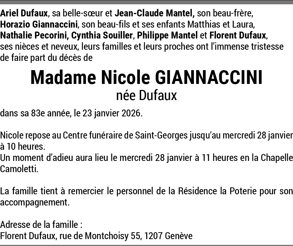 Au revoir Nocole 26.01.2026 Signaler Je garde de beaux souvenirs de toi et Acir , de nos voyages et nos moments joyeux passés ensemble le long des années, jusqu'à ce que la maladie te change complètement. De la part de Graciela LUSSO