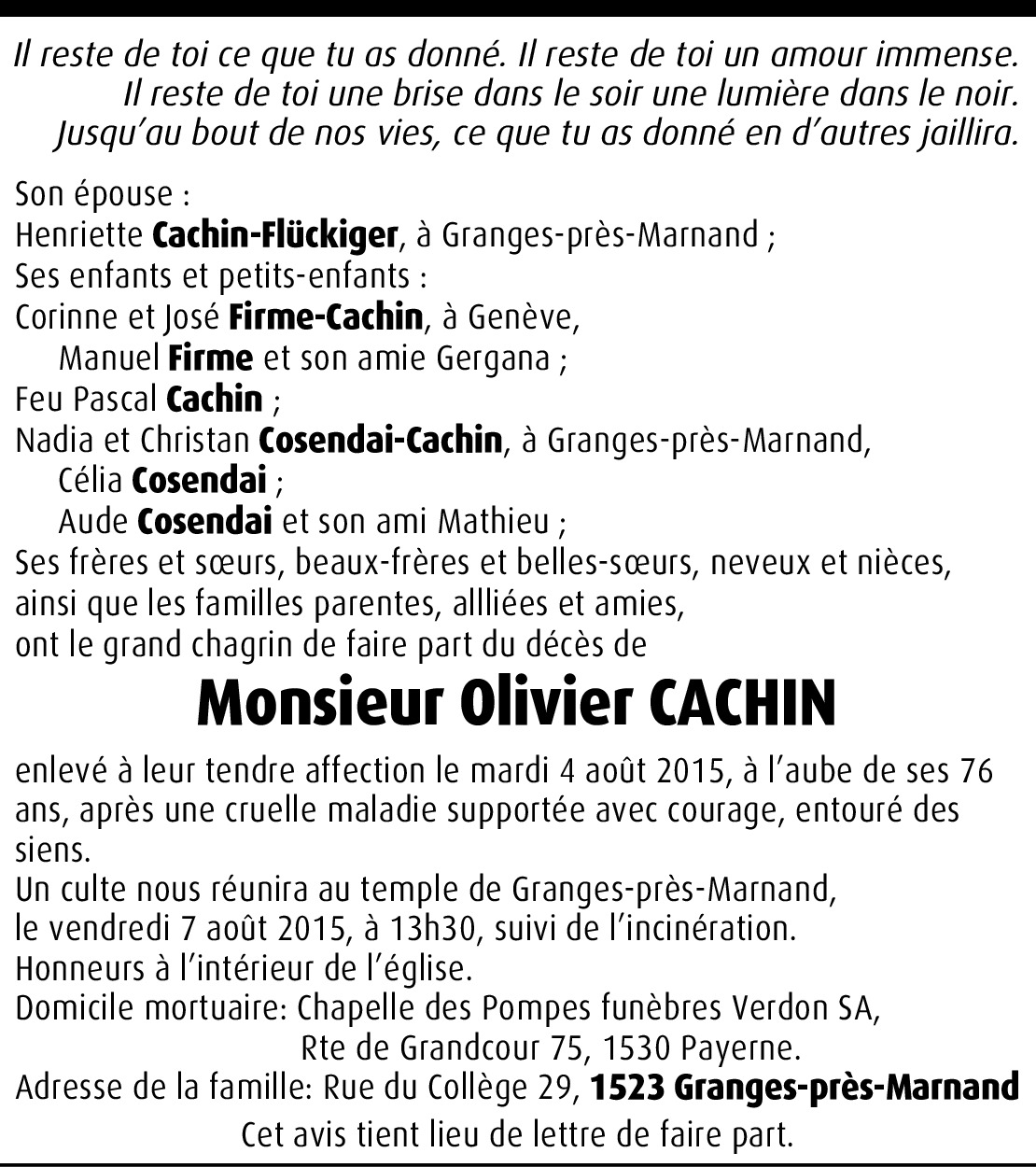 Il y a plus de 4 ans Signaler Chère Famille, c'est avec tristesse que j'ai appris la nouvelle. Je suis en pensées avec vous et vous présente mes sincères condoléances. De la part de Jean-François Chappuis