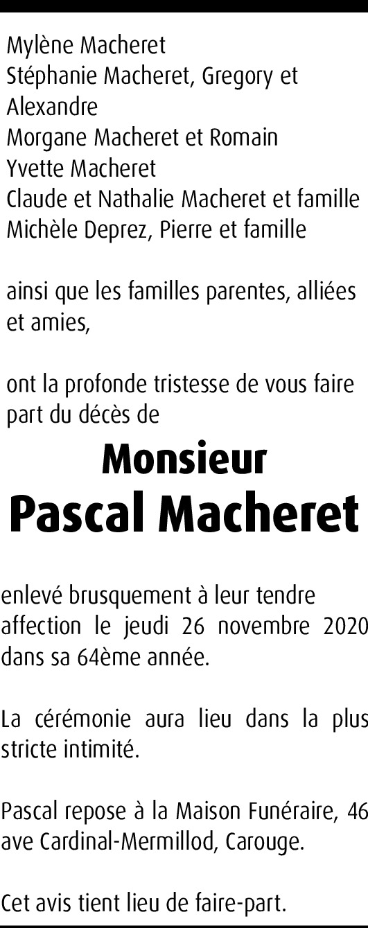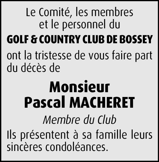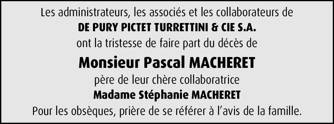 Je viens d'apprendre le décès de M. Macheret et en suis bouleversée. Cliente depuis 2005 avec mes nombreux enfants, je peux témoigner qu'il a été le seul opticien qui a été si gentil + a compris problèmes neuro envahissant aussi le visuel. Habitant Leysin depuis 2016, j'avais continué à venir à Genève pour lunettes chez lui: il était le SEUL à réussir à tester et adapter !!! Depuis covid, j'ai dû consulter quelqu'un d'autre plus près, mais rien ne va. C'est en souhaitant retourner vers lui que j'ai appris son décès, et cela m'attriste +++, car c'est un être exceptionnel d'humanité et d'intelligence fine qui a quitté cette terre. Soyez tous abondamment consolés et bénis par l'Eternel Lui-même, qui est si bon et au-dessus de tout.
