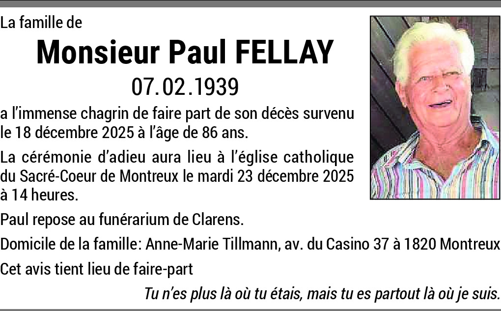 Cher Paul 21.12.2025 Report Sincères condoléances et toute ma sympathie à la famille, amis et connaissances Olivier Formaz Av. Casino 35 De la part de Formaz Olivier