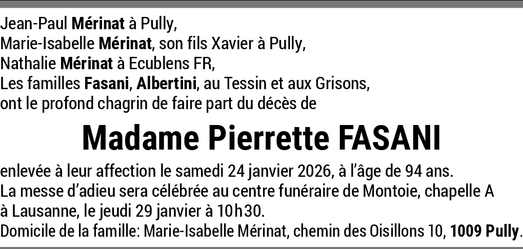 Au revoir… 26.01.2026 Signaler Chère Pierrette, Merci pour votre accueil, votre sympathie, votre sourire et les rires partagés. Vous allez me manquez. Que Dieu vous ouvre les bras et les portes du Paradis. Mes sincères condoléances à la famille et aux proches. De la part de Samira