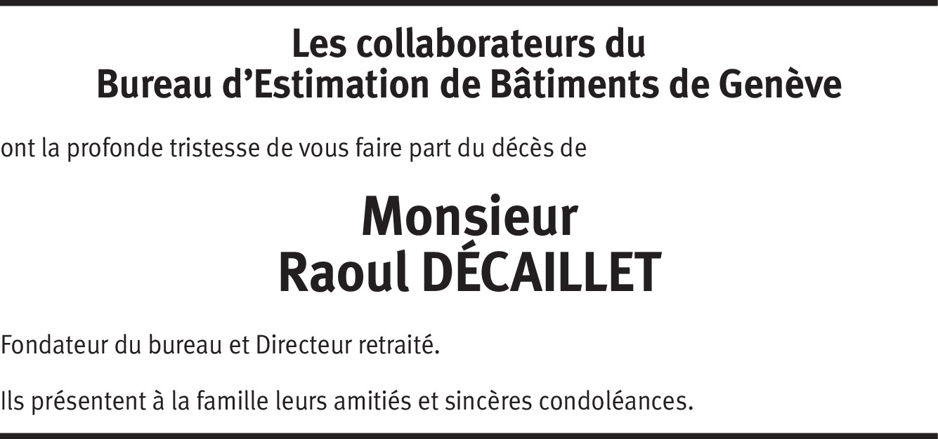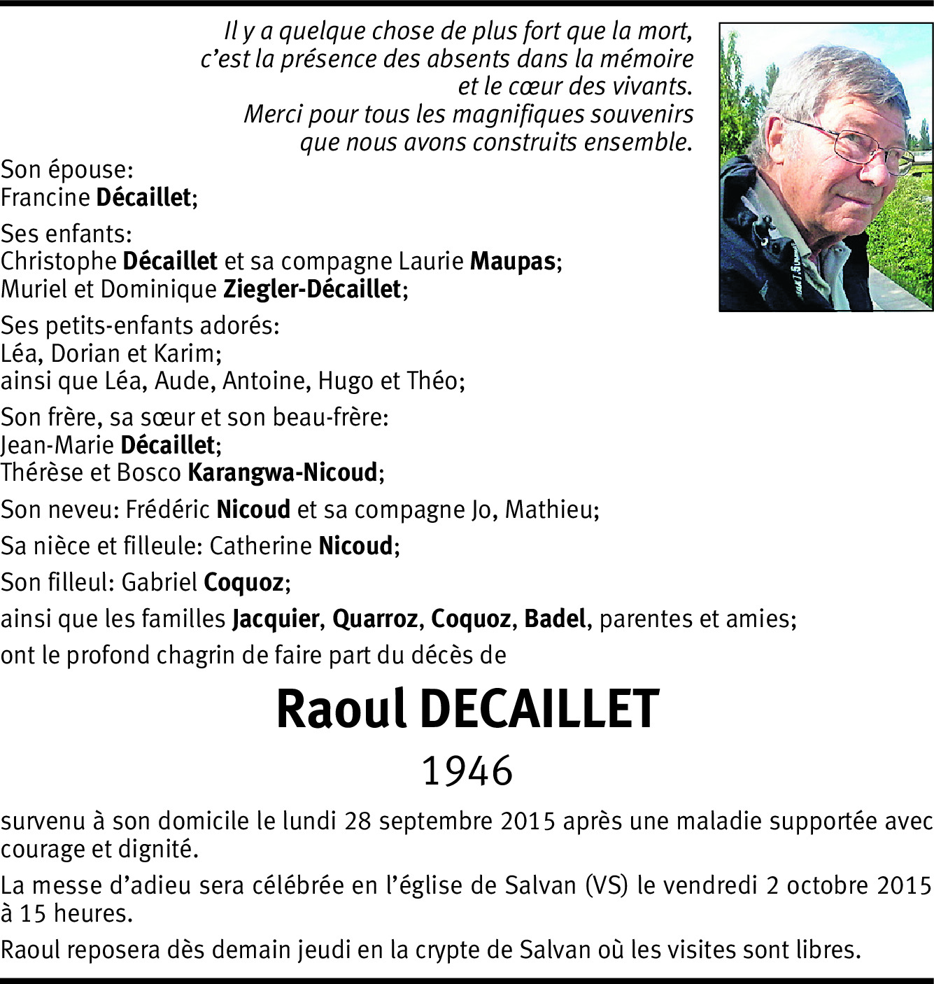 Il y a plus de 4 ans Signaler J'ai eu le plaisir de collaborer professionnellement avec Raoul. Je garde le souvenir d'un homme droit, volontaire et soucieux du travail bien fait. Toute ma sympathie à ses proches en cette douloureuse épreuve. Jacques Joray De la part de Jacques Joray