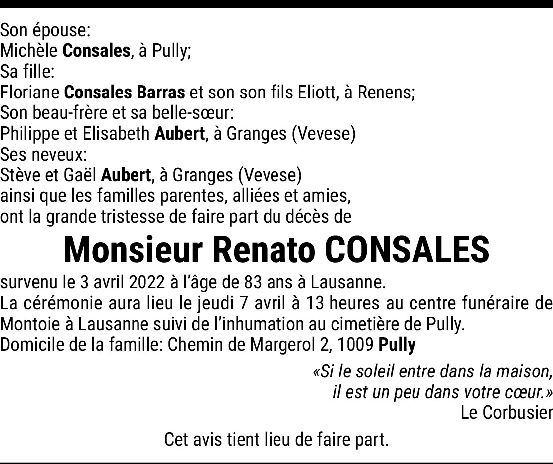 C’est avec tristesse que j’apprends le décès de Renato. Il était un homme doux et respectueux d’autrui. Nous nous croisions au tennis, dans notre rue et au Charbon. Je me souviens qu’il avait construit l’escalier hélicoïdal du duplex que nous occupions à Margerol. Je suis en pensée avec vous en ces moments de séparation. Avec mes meilleurs messages.