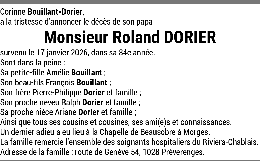 En pensées émues 24.01.2026 Signaler Chère Corinne, Une page se tourne au sein de ta famille mais les plus beaux souvenirs trouvent une place dans ton coeur. Ce sont des moments de tristesse, je pense beaucoup à toi et t adresse toute ma sympathie De la part de Marlène Borloz
