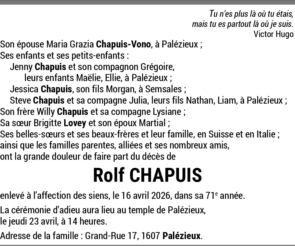 C'est avec une grande tristesse que j'ai appris le décès de votre parent. Rolf était un ami d'enfance lorsque nous habitions à Chavornay. Ensemble nous avons partagé des moments inoubliables, notamment un petit élevage de lapins. Le temps à fait que nous nous sommes perdus de vue mais je n'ai jamais oublié ces merveilleux moments passé ensemble.