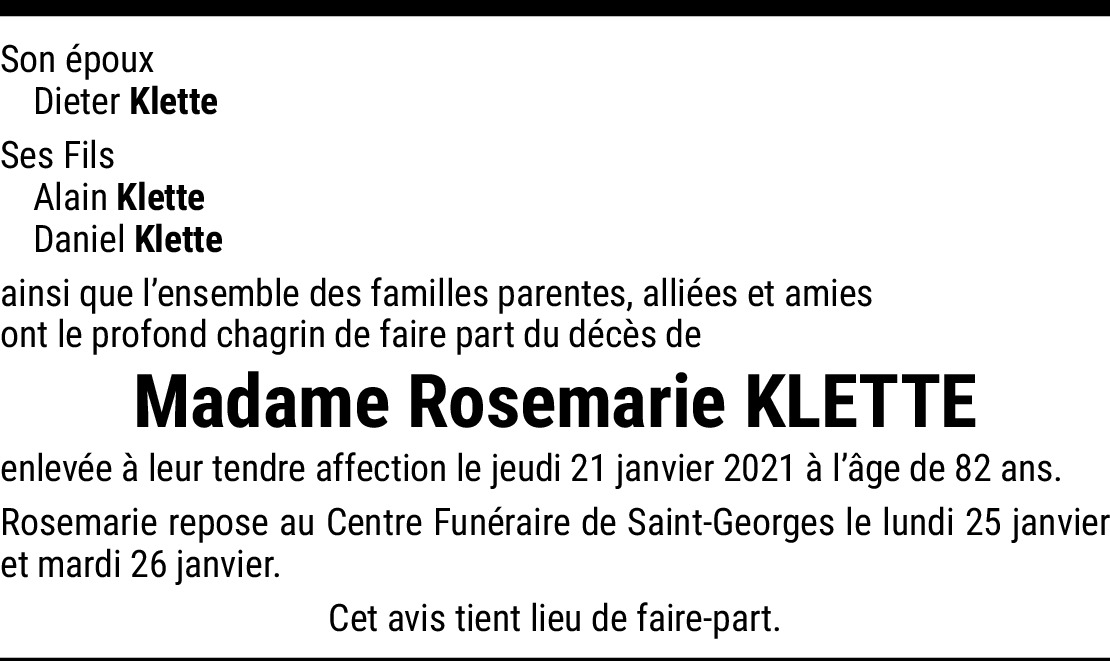 Nous transmettons nos très sincères condoléances à Didier, son époux et ses chers enfants Daniel et Alain.