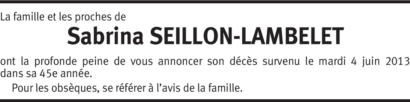 Au revoir ma petite Sabrina on a vécu pas mal de choses depuis l'Alpina cet internat où nous nous sommes connues et devenues les meilleures amies du monde, nous étions si semblables. Je suis si triste de n'a pas avoir été prévenue avant aujourd'hui et de ne pas avoir pu t'accompagner à ton dernier voyage. Je t'aime ma petite puce et tu vas beaucoup me manquer, je souhaite le meilleur du monde pour tes trois enfants Titine Roger et Christian je sais que maintenant tu es en paix. Sabine