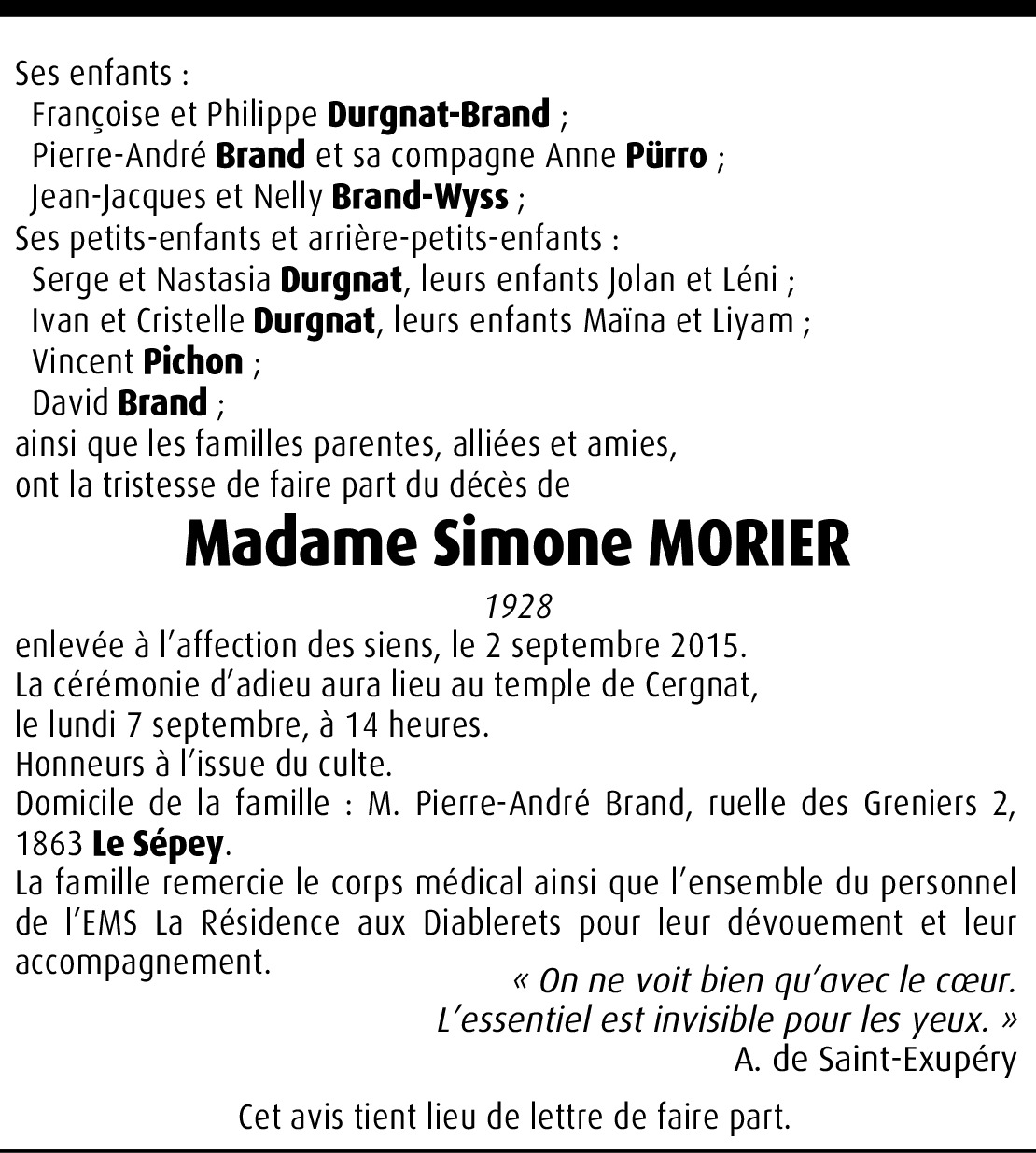 Je suis passé voir Mme Simone Morier il y a 2 ou 3 ans et j'avais l'intention de revenir la voir la semaine prochaine quand j'ai découvert sur Internet cette triste nouvelle. J'avais préparé des photos pour lui parler de mon grand-père Ulysse Constant Ginier et partager des souvenirs. Je suis vraiment très triste. Elle était si bienveillante. Veuillez accepter mes condoléances tardives mais sincères. Mireille Fuchs