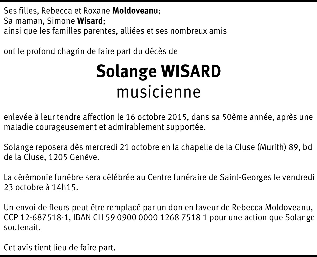 Chère Solange, je tenais à te dire tout ce que tu m'as apporté, par ta joie dans ta musique, par ton immense talent pédagogique, par ta passion pour l'humain, par ton amour de la vie, par ton humour. Pour moi, tout cela vit et vivra en moi pour toujours, car c'est ce que tu m'as transmis de toi. Je ne t'ai vue que 9 fois, lors de 9 stages de musique de chambre... mais ces 9 rencontres sont bien plus que "neuf", car elle seront toujours "neuves" et bien vivantes en moi. Bien sûr, tu me manques et vas terriblement me manquer. Je souhaite à Rebecca et Roxane de trouver la force pour traverser ce moment douloureux, d'avoir le courage de vivre leurs émotions et de transcender cela par un apaisement par la suite. Catherine Delétra
