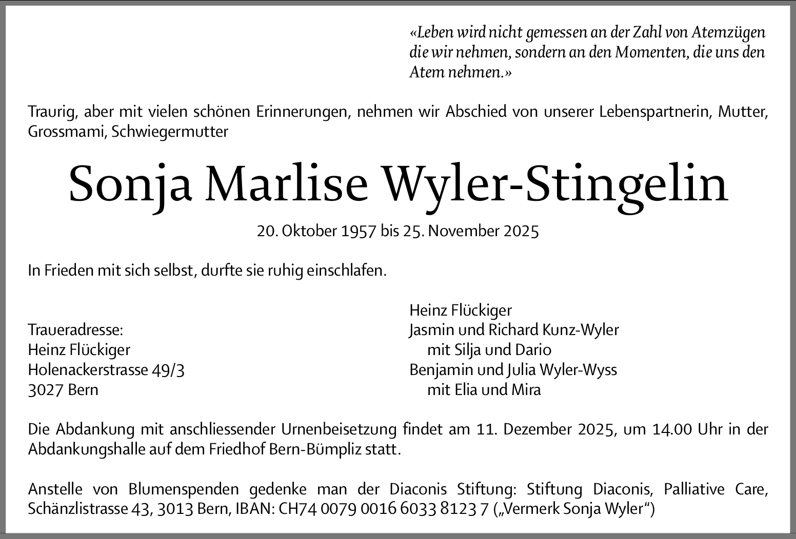 Mein herzliches Beileid an Euch zum Tode von Sonja. Sonja war ein grosser Teil meines früheren Lebens und wird mir immer in Erinnerung bleiben. Lieber Heinz, ich wünsche Dir, dass Du trotz diesem grossen Verlust Deiner geliebten Partnerin Dein Leben so weiterführen kannst, wie Du Dir das wünschst. Alles Gute. lieber Gruss Isabelle