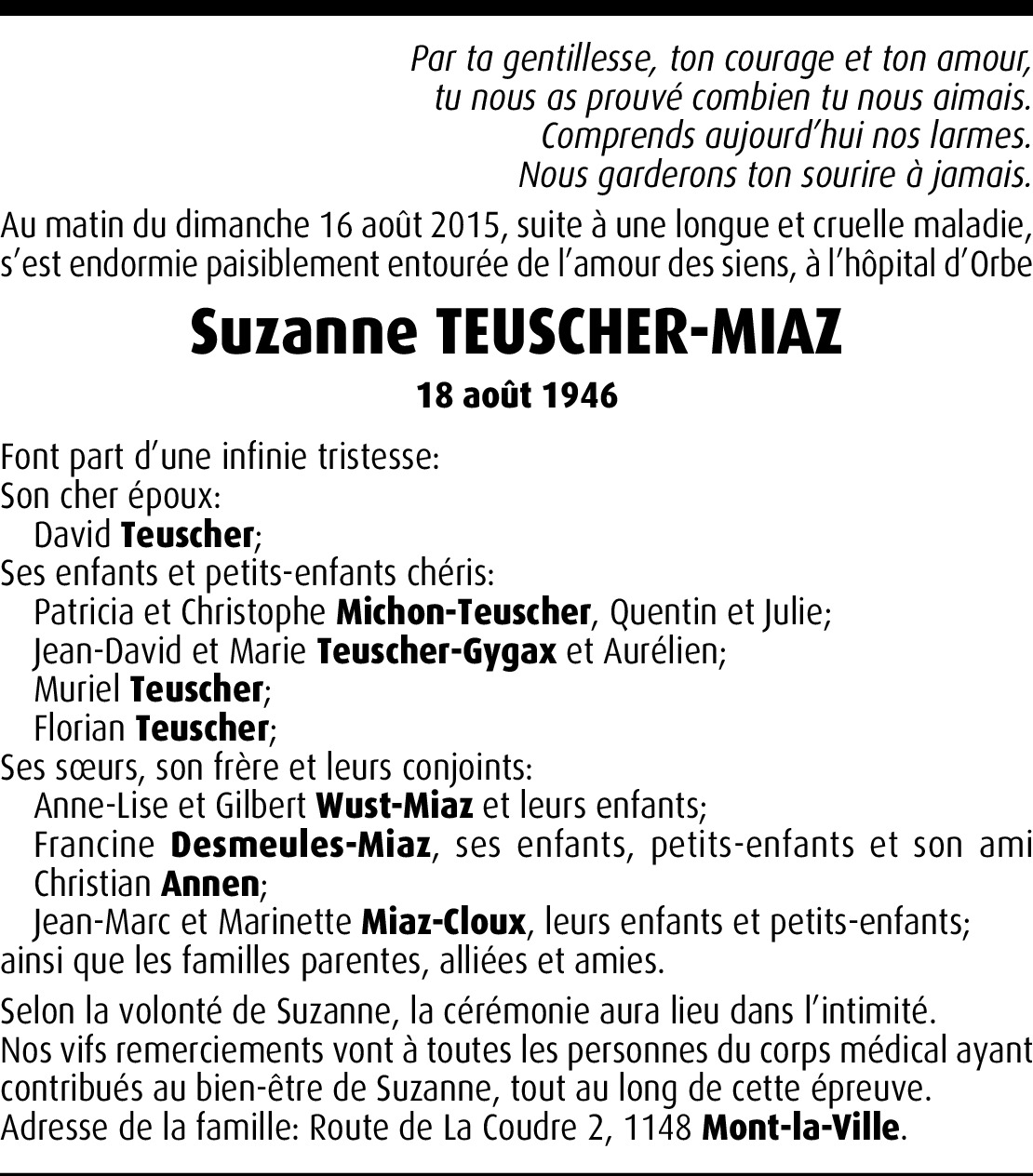 Il n'y a pas de mots pour exprimer à quel point nous sommes affligés par la dure perte que vous vivez. Nous espérons simplement que notre sympathie vous apportera un certain apaisement. David et famille, nous avons perdu une Suzanne exceptionnellement bonne et attentionnée. Nous en garderons le meilleur souvenir et à jamais.
