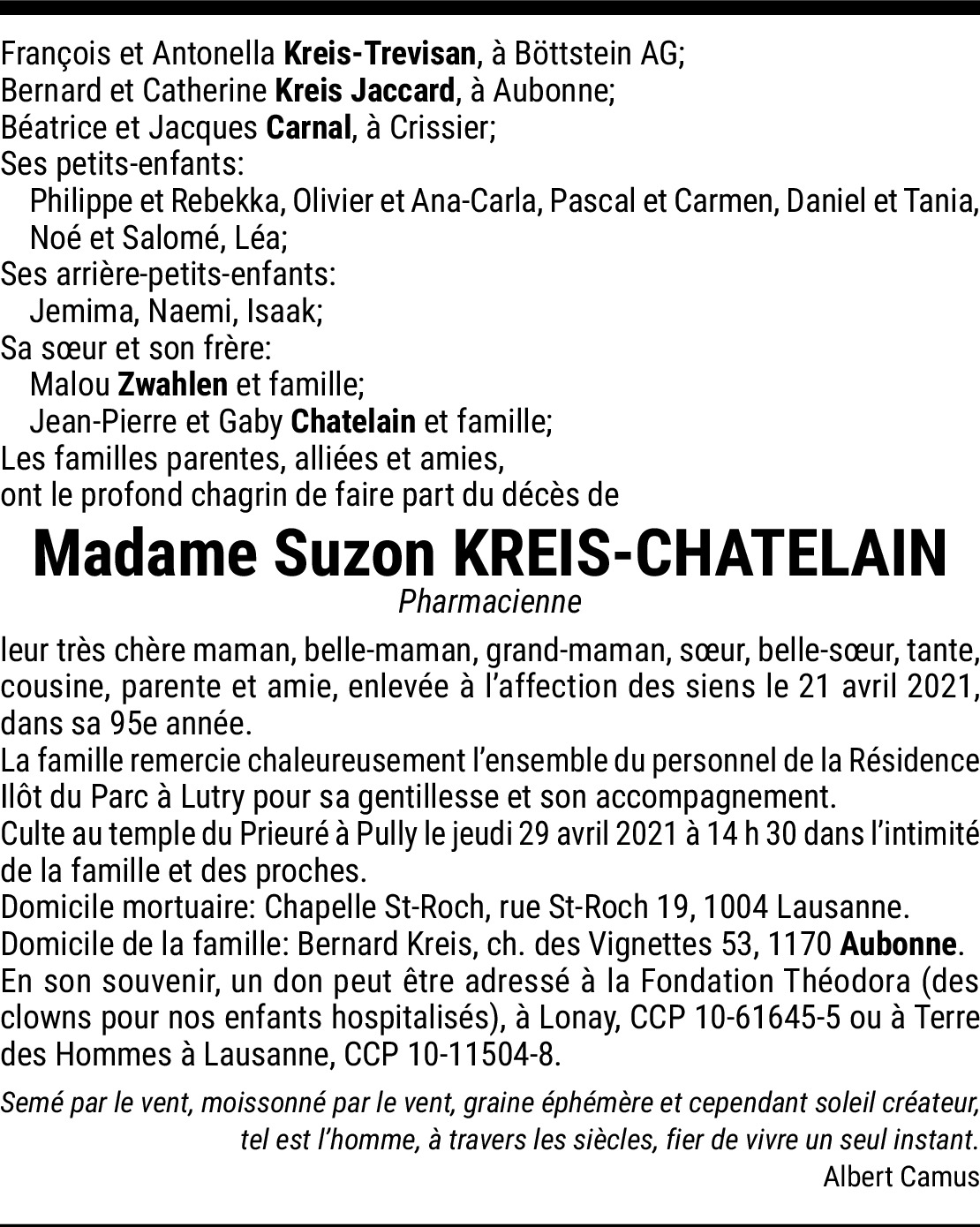 Il y a plus de 4 ans Report L'Association des amis de Marius Borgeaud gardera le meilleur des souvenirs de Madame Kreis, une de nos membres particulièrement fidèles. Elle assure sa famille de sa vive sympathie. De la part de Jacques Dominique Rouiller