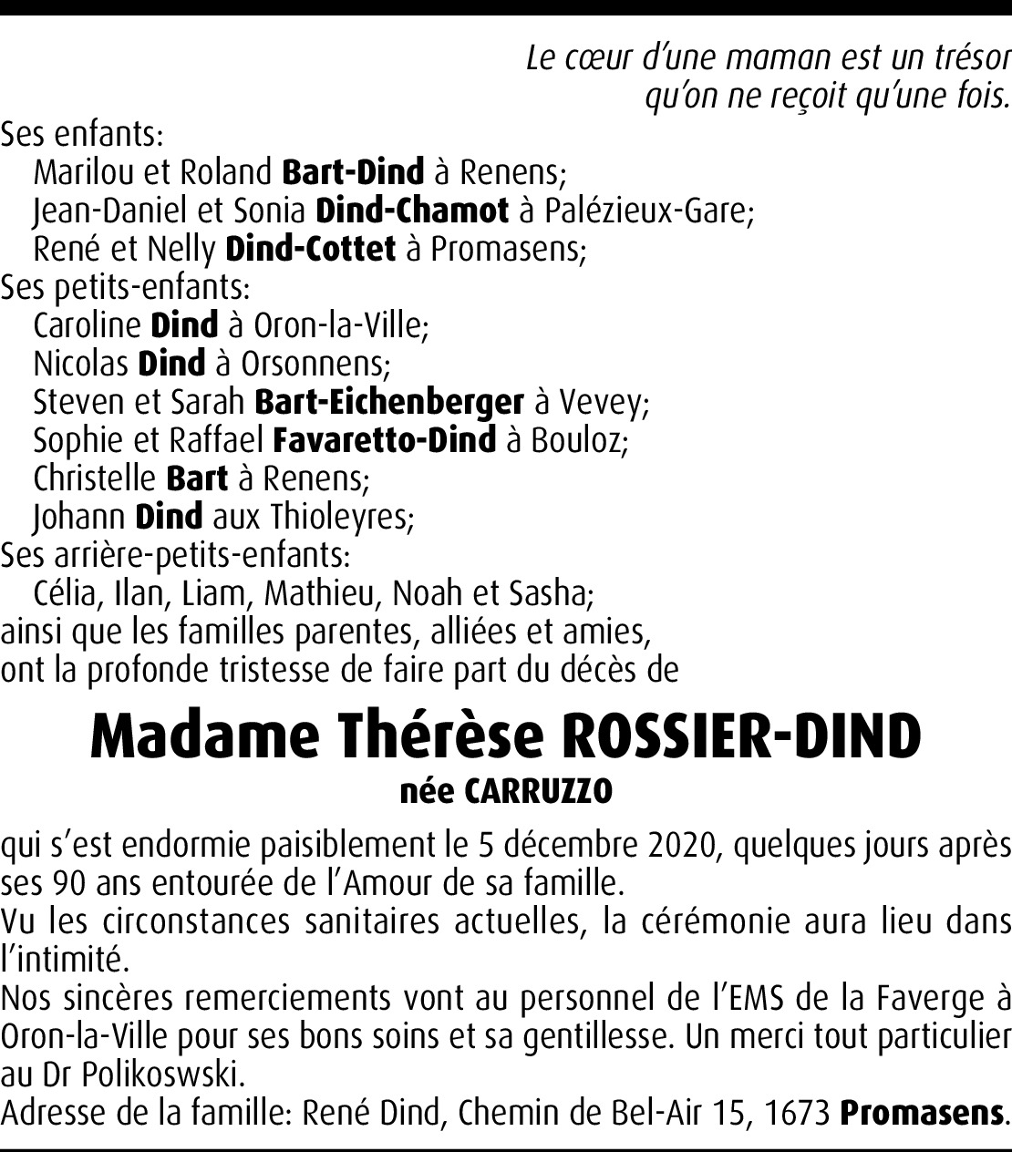 Il y a plus de 4 ans Report Chère famille, De tout cœur avec vous dans cette douloureuse épreuve, je vous transmets toute ma sympathie et vous souhaite beaucoup de courage. Anne-Marie Richoz, amie de Mr Raymond Peclard qui aimait beaucoup votre maman. De la part de Anne-Marie Richoz