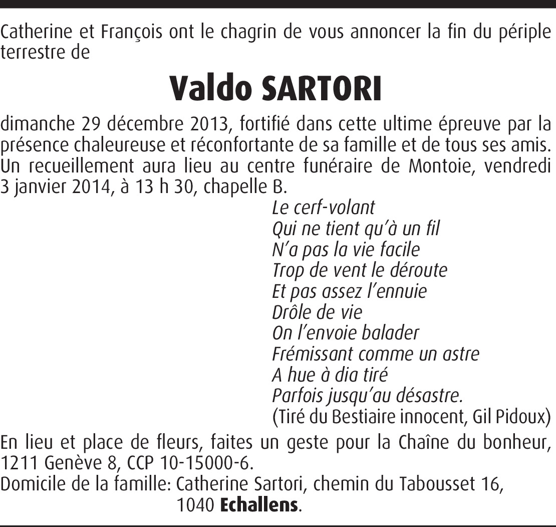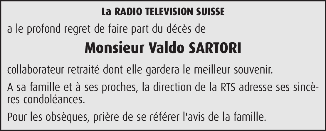 A mon cher Ami Valdo ! MERCI ! pour tout ce que tu as fait pour la MUSIQUE et les MUSICIENS, chanteurs, etc… J'ai encore eu beaucoup de plaisir à te côtoyer dans un Kiosque à musique de la RTS, à t'aider à trouver un groupe pour remplacer une défection de dernière minute, à participer à un enregistrement dans ton studio d'Echallens pour un groupe de jeunes musiciens de la région. Et chaque fois, avec un réel plaisir de retrouver ton Amitié, ton Sourire et ta bonne humeur. Salut l'Artiste, oui, tu étais le bienfaiteur des Artistes qui étaient "bloqués" par un de tes microphones en plein enregistrement… et tu avais toujours les mots pour détendre l'atmosphère et redonner de la "pêche" à la personne concernée. Merci Valdo et bon voyage au Royaume des Artistes déjà partis, que tu vas retrouver pour un futur enregistrement. Roland Biollay GUY ROLLAND-SEXTET + GUY ROLLAND SHOW-BAND