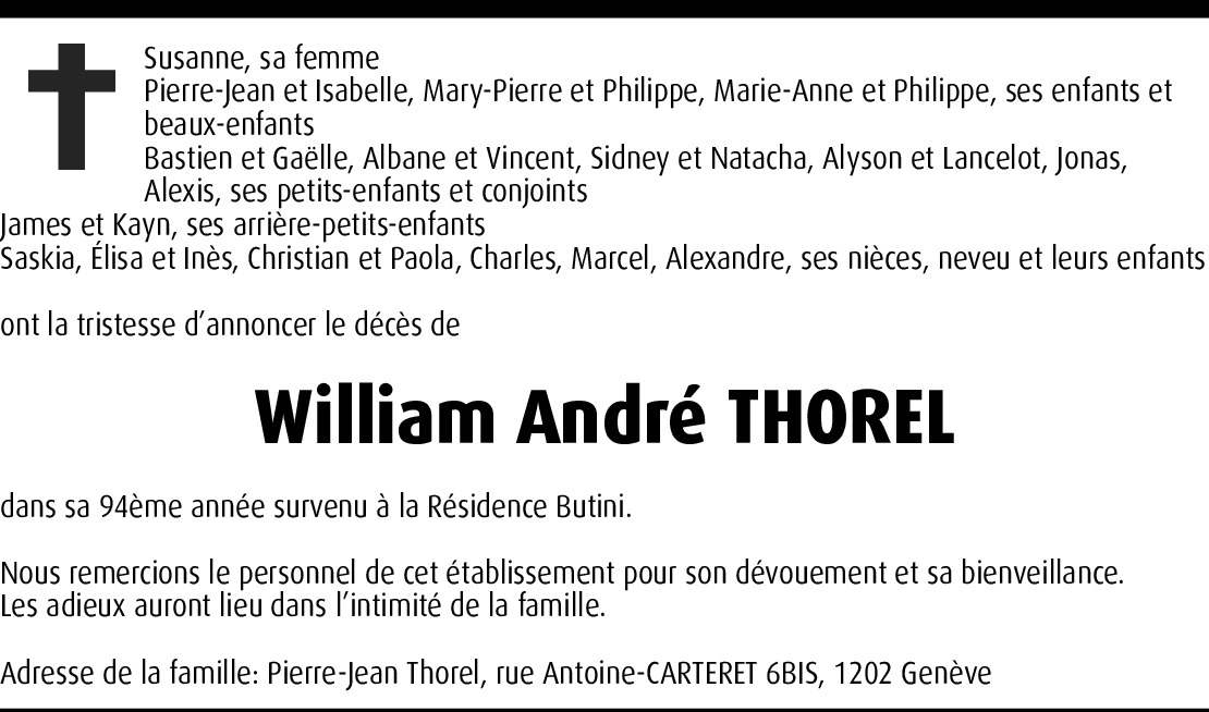 Il y a plus de 4 ans Report Condoléances à la famille de William Thorel, notre voisin à Onex pendant de nombreuses années. De la part de Gérald Rossier
