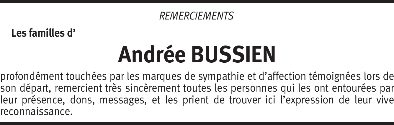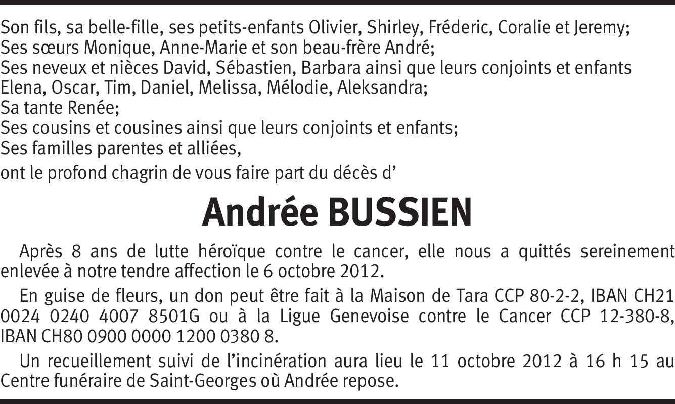 Andrée, femme courageuse qui a su garder même dans les moments les plus difficiles, son regard plein de curiosité aux autres. Elle est une amie de longue date, elle m'a appris et m'apprend encore comment voir le monde, avec simplicité et intelligence. Son art de vivre est désormais gravé dans mon esprit, il m'a marqué (elle le savait) et me marquera à jamais. Andrée je peux te le dire en toute simplicité : nous sommes beaucoup à t'aimer, et tu continueras à vivre sur cette terre par le souvenir, car nous serons nombreux à évoquer tous ces moments forts avec toi. Mes pensées vont à ses proches et leur chagrin. A bientôt Andrée.