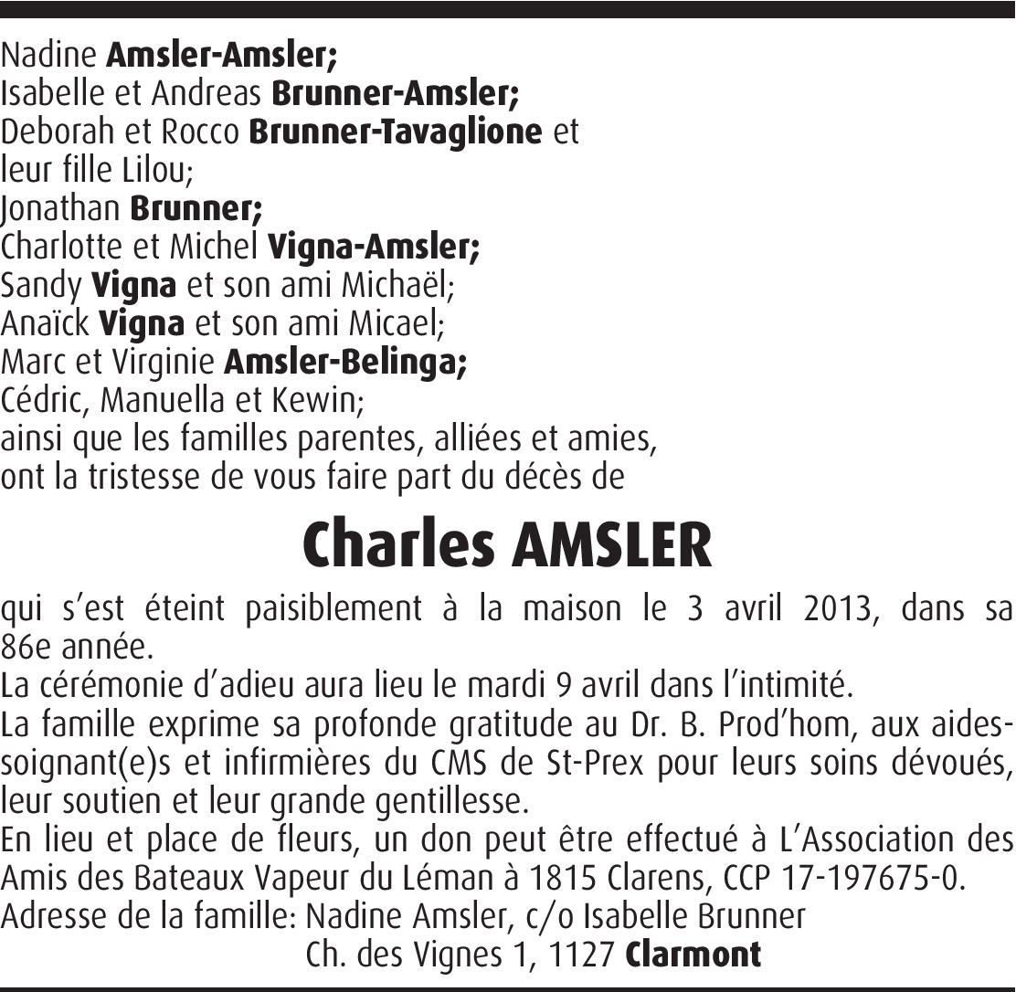 Bonjour Nadine, mit grosser Trauer erfuhr ich heute vom Ableben meines lieben Götti Charles!
