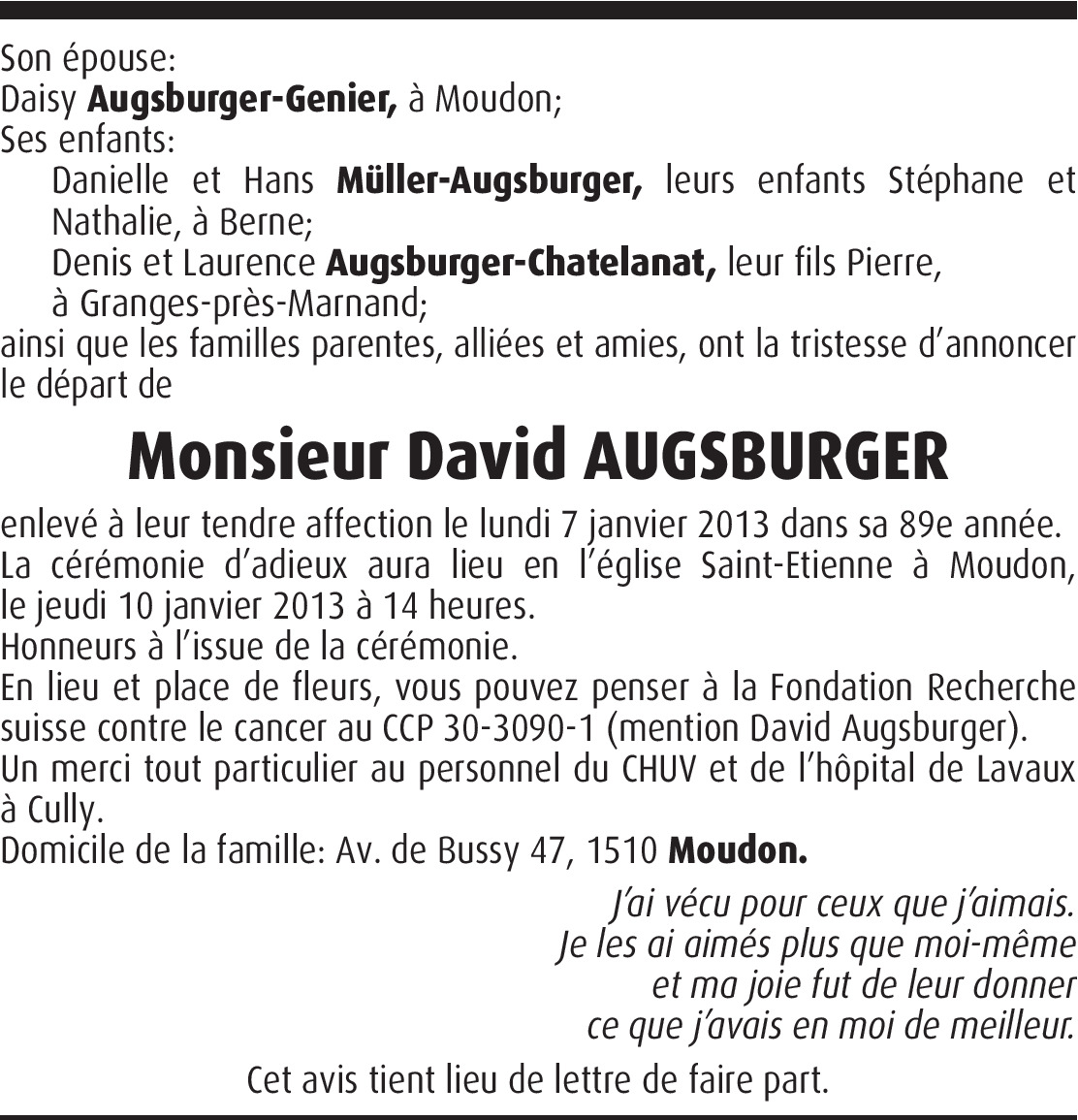 Vor mehr als 4 Jahren Melden Chère famille, c'est avec tristesse que nous avons appris la nouvelle. Nous sommes en pensées avec vous et nous vous présentons nos sincères condoléances. Von Jean-François Chappuis