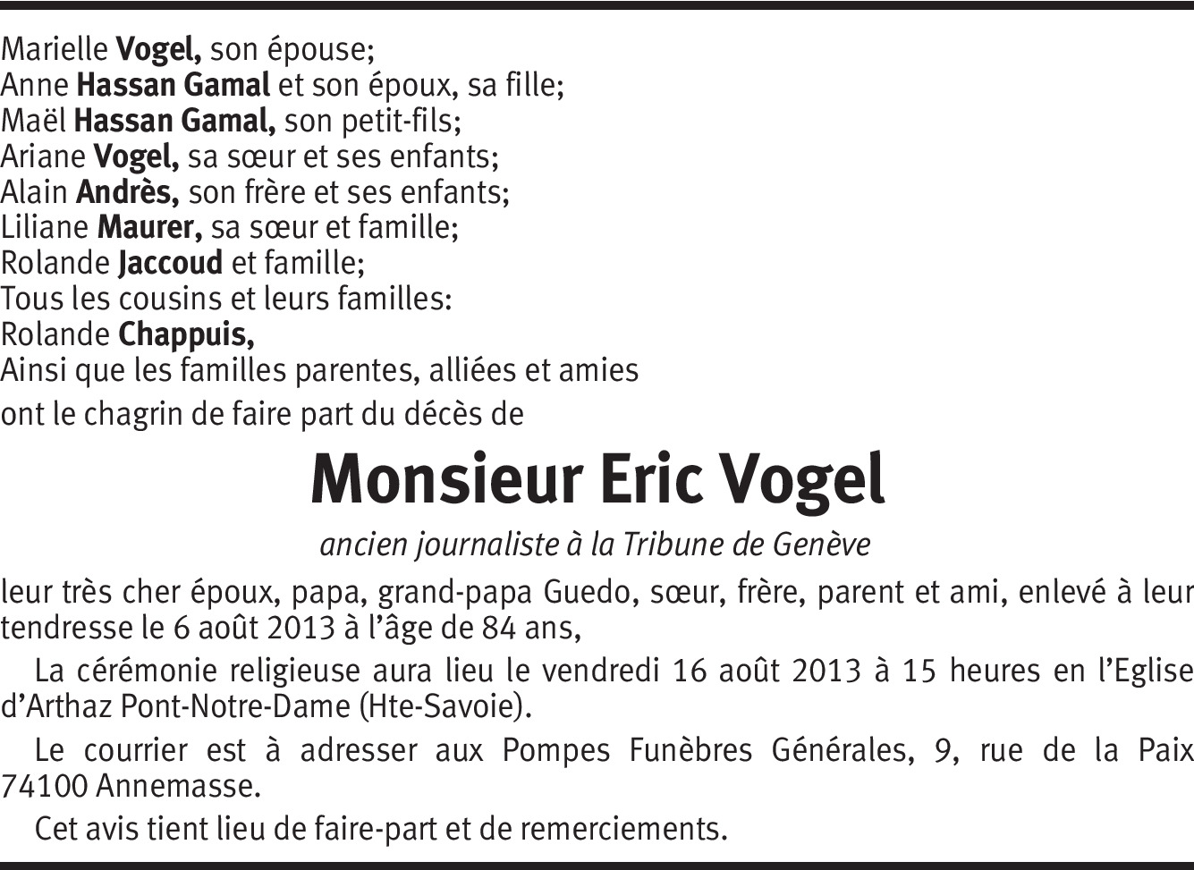 Bon voyage, cher Eric, du côté des nuages, à toi qui fus un si charmant compagnon de route du temps de La Tribune de Genève, tellement ouvert aux autres, si enthousiaste de tout ! Je me souviendrai longtemps des longues discussions qui ont enrichi la jeune stagiaire que j'étais alors. Mes pensées émues à ta femme Marielle, dont je me souviens avec affection, même si tant d'années ont passé depuis nos furtives rencontres, le soir, dans les couloirs de la rédaction... Que cet au-delà te soit doux, Eric, toi qui fus si tolérant avec tous. Je ne t'oublierai pas. Viviane MG