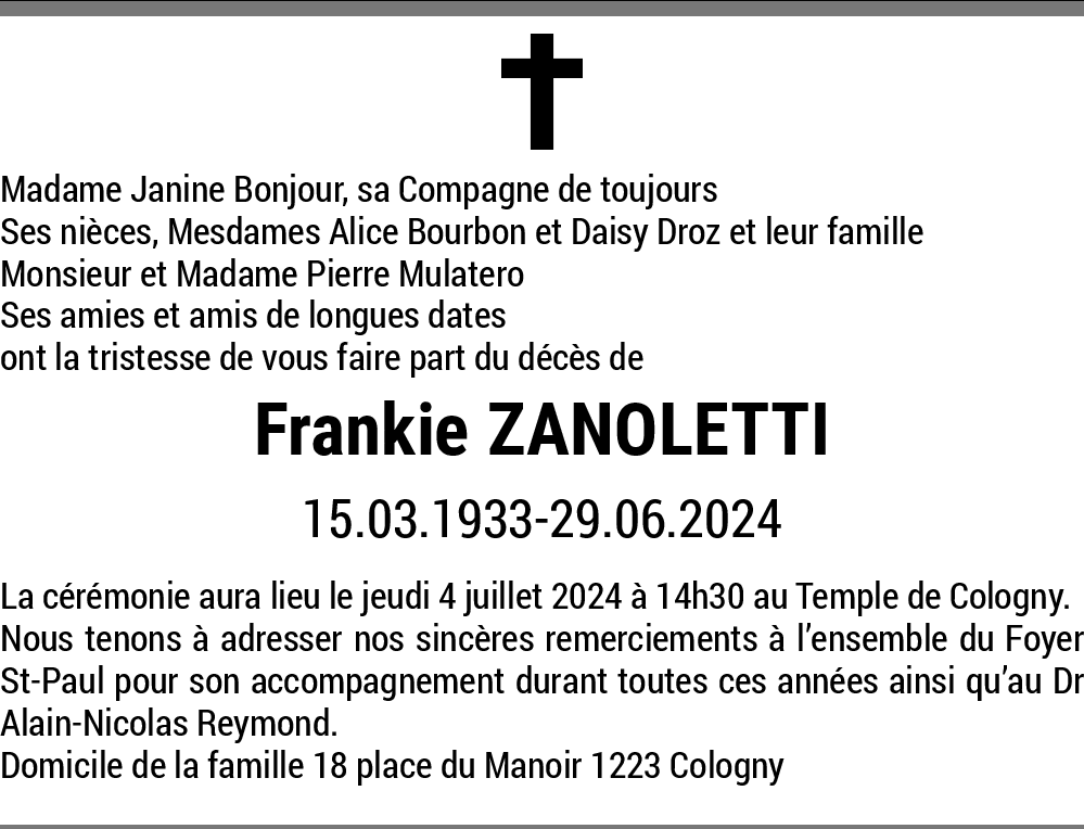 La cérémonie aura lieu au Temple de Cologny ce jeudi 4 juillet 2024 à 14h30.