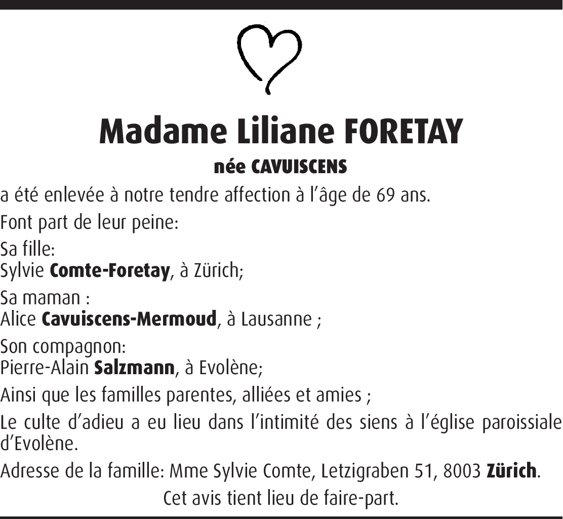 Nous sommes tristes d'apprendre le décès de votre chère maman, et vous souhaitons beaucoup de force, chère Sylvie. Je suis un cousin de Liliane Foretay, le fils de Gaston Cavuiscens. Nos Pensées sont avec vous. Alexandre et Lilo Cavuischens. 3904 Naters