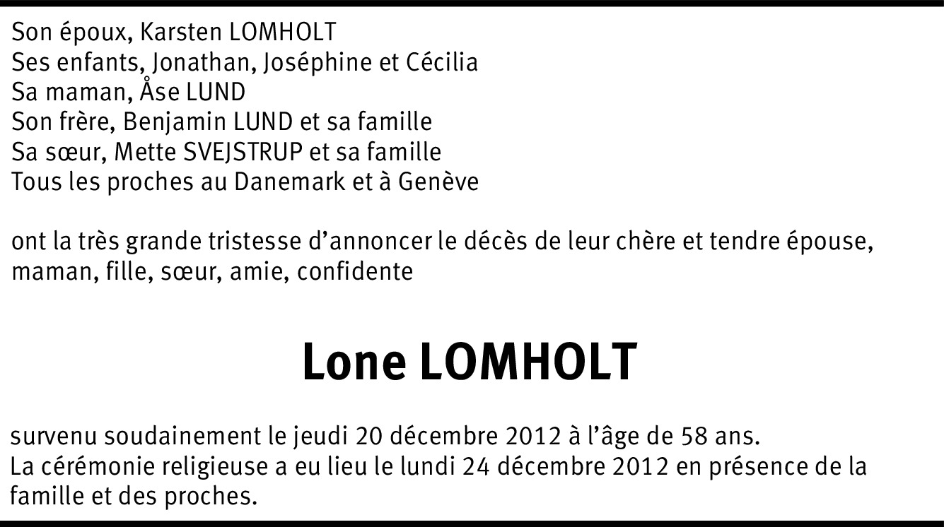 Patiente depuis plusieurs années de Lona c'est avec une profonde tristesse que j'ai appris son départ pour un monde meilleur s'il en est. Je présente à sa famille et ses collègues mes sincères condoléances et du courage pour le vide que Lona laissera. Reposez en paix chère Lona, votre sourire et votre gentillesse me manqueront. Jocelyne Rieder.