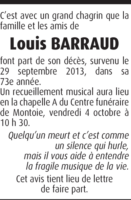 Vor mehr als 4 Jahren Melden Je vous présente à toute la famille Barraud mes sincères condoléances J Gerber. Von Janine Gerber