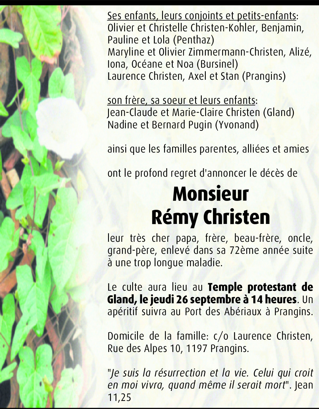 C'est seulement aujourd'hui que j'apprends le départ de mon frère dans le Seigneur Rémy. Je suis du Canada et j'ai rencontré Rémy en 2006. Je n'ai rencontré que son fils Olivier. Mon cœur est avec la famille et en même temps je me réjouis que maintenant Rémy est dans la présence du Seigneur. Soyez bénis
