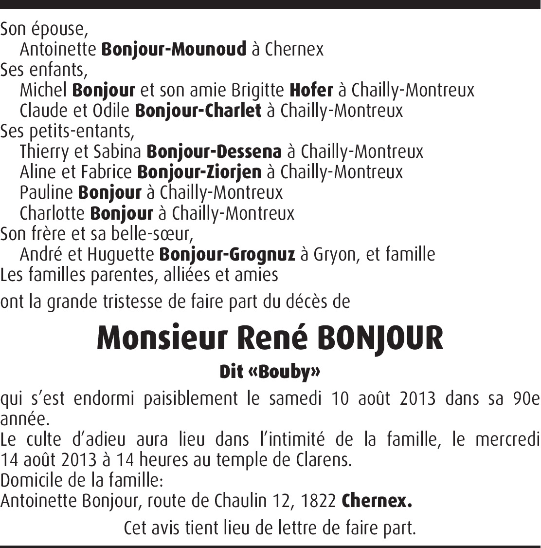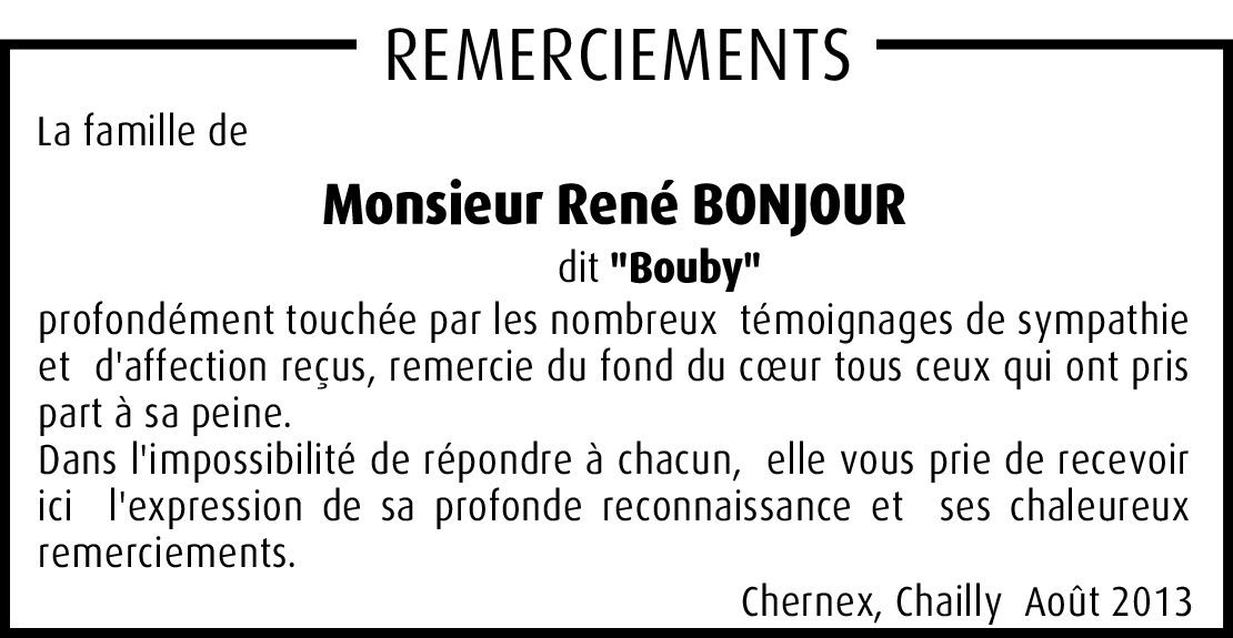 Je garderai de Bouby un excellent souvenir, toujours souriant, toujours de bonne humeur. J'adresse à toute la famille ainsi qu'à Mme Bonjour, toutes mes sincères condoléances.