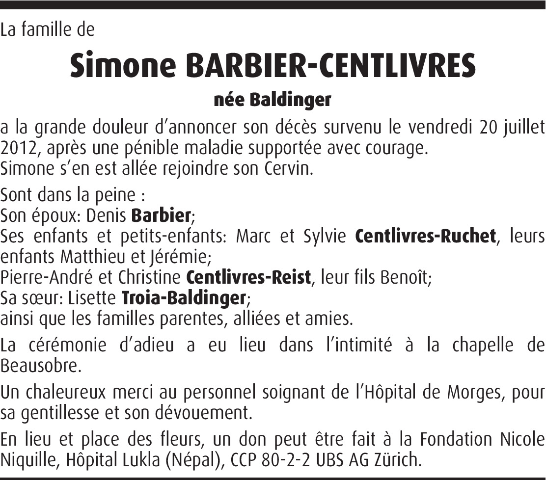 Vor mehr als 4 Jahren Melden Cher Denis, C'est avec grande tristesse que j'apprends le déces de ton épouse. Sache que mes pensées t'accompagnent dans cette épreuve pénible. Mes sincères condoléances. Christian Von Christian Gisler