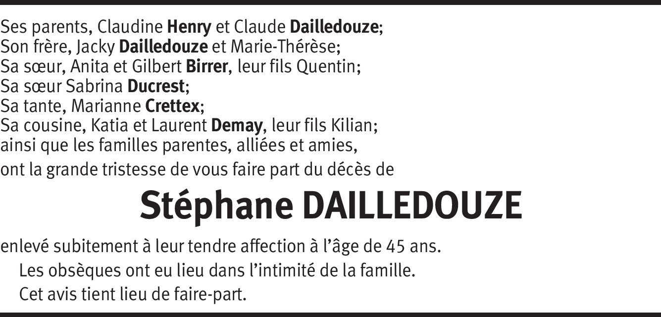 Vor mehr als 4 Jahren Melden Monsieur et Madame Claude Dailledouze, C'est avec émotion que j'apprends le deuil qui vous frappe si cruellement. Je vous présente mes sincères condoléances. Luc Dailledouze (Paris-France) Von Luc Dailledouze