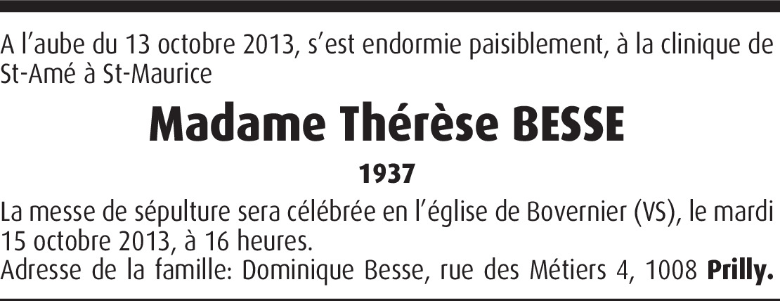 N'ayant pu me libérer de mes obligations professionnelles pour la messe d'adieu pour Tante Thérèse qui a rejoint le ciel, je vous présente mes vœux de condoléance et de soutien pour ce moment de séparation et de chagrin.