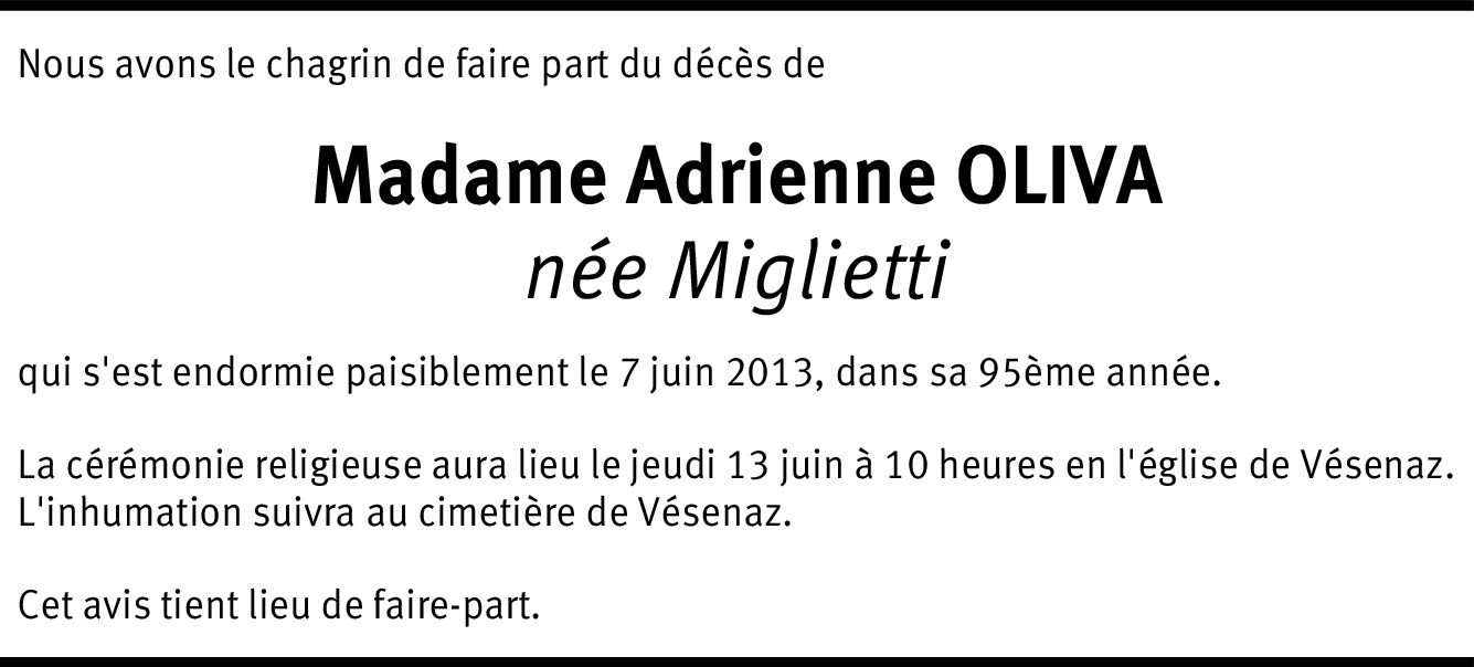 Adrienne Miglietti fut une magnifique artiste lyrique. Soprano coloratura, elle fit les beaux soirs du Grand-Théâtre de Genève (débuts en 1948) et des principaux centres lyriques helvétiques. Elle chanta des premiers rôles de soprano coloratura tels que la Reine de la nuit, Konstanze, Zerlina, Lucia di Lammermoor, Norina, Gilda, Violetta, Ophélie, Lakmé, Philine, etc. Sa carrière la conduisit sur les principales scènes européennes. Elle consacra une part importante de son activité au concert et laisse des enregistrements. Artiste élégante et à la musicalité infaillible, elle laisse le souvenir d'une belle artiste racée et d'une femme élégante et discrète.