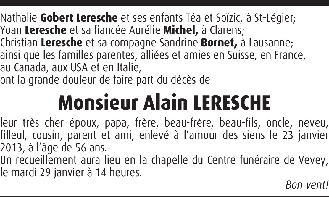 Souhaitons un beau voyage à Alain que nous regretterons vivement... Je remercie le destin qui nous a fait nous rencontrer lors de cette croisière. Toutes nos condoléances et notre amitié, nous pensons trés fort à vous. Bises Brigitte et Stéphane Grancher.